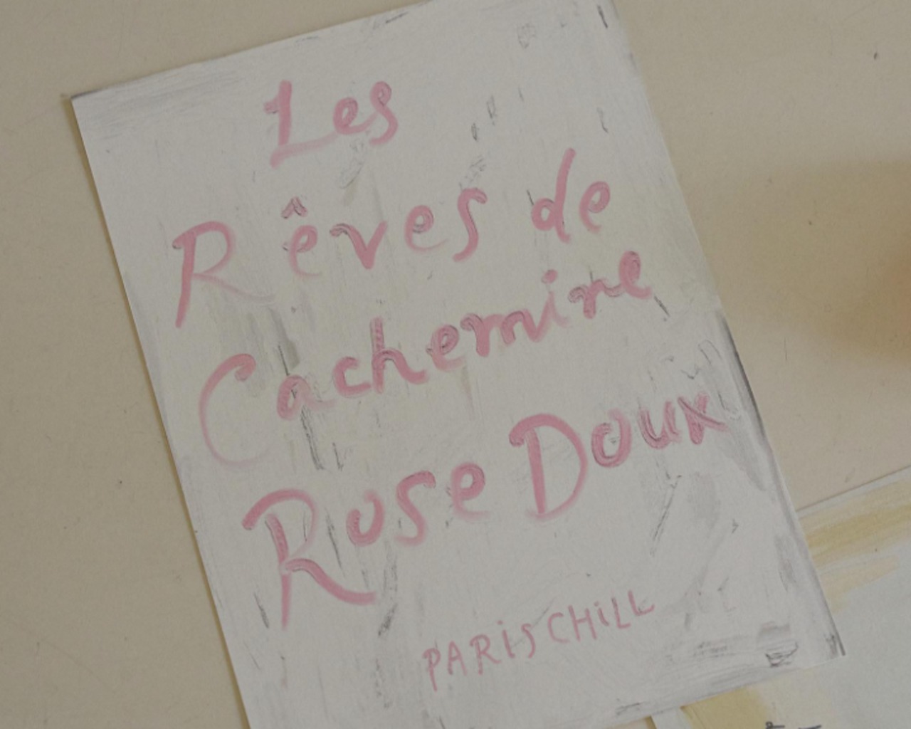 荒い筆タッチ感の背景と、幻想的なピンク色のレタリングで表現。